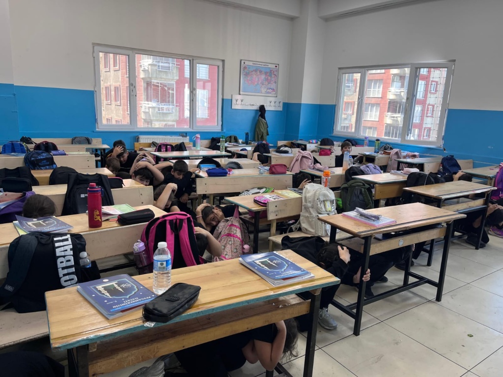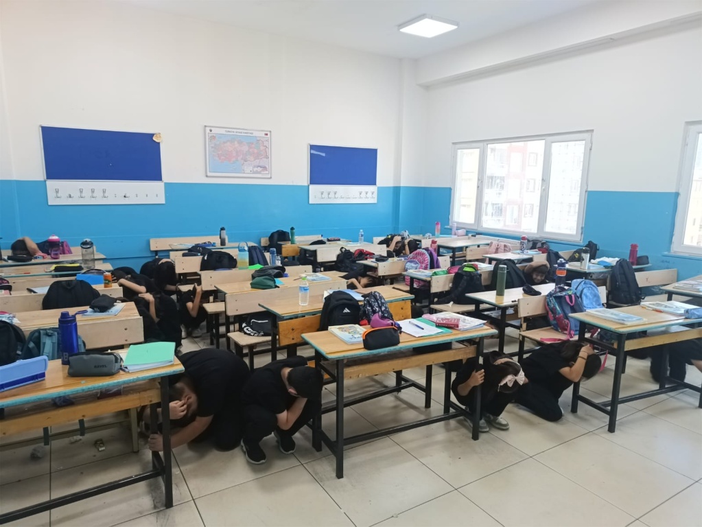 Okulumuzda planlı tahliye ile "ÇÖK-KAPAN-TUTUN" ardından "TAHLİYE" tatbikatı gerçekleştirildi. Afet farkındalığını arttırmak ve olası risklere karşı hazırlıklı olmak amacıyla düzenlenen tatbikat sırasında öğrencilerimiz ve öğretmenlirimiz deprem anında yapılması gerekenleri uygulamalı olarak deneyimledi.